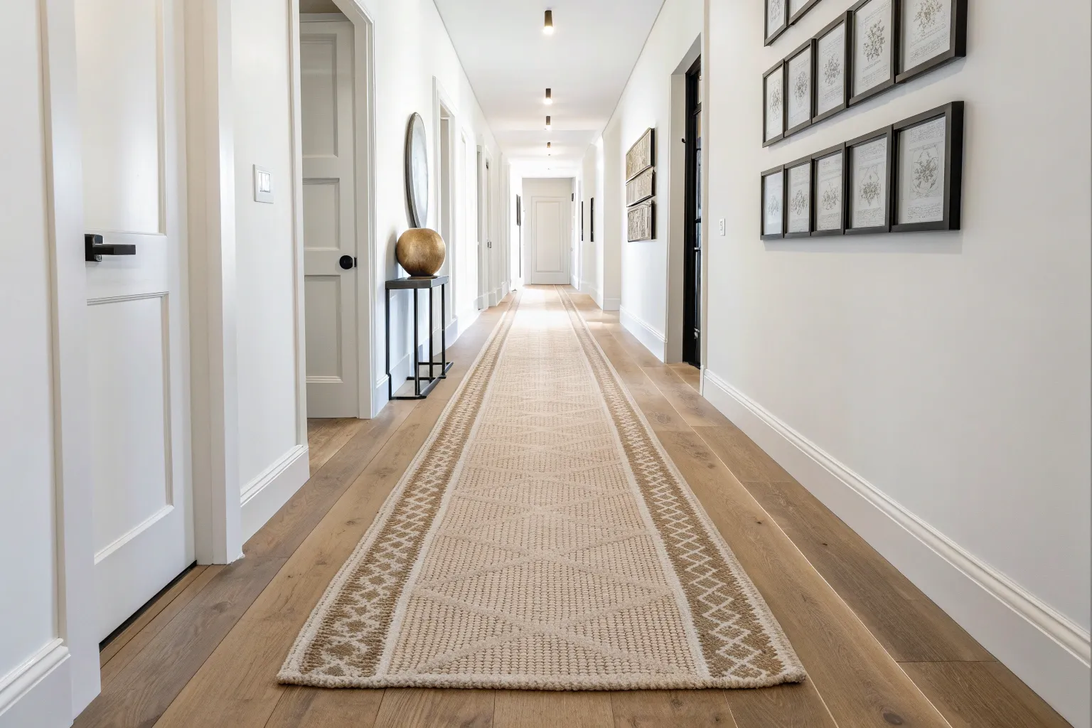 A patterned runner rug adds warmth, hides scuffs, and makes a narrow hallway feel finished.