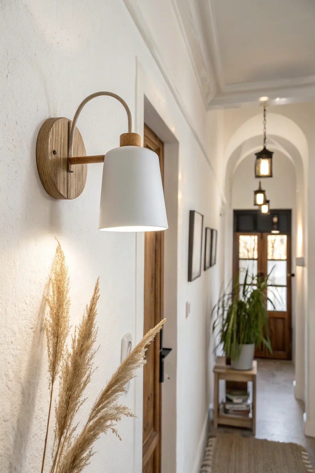 • Minimalist Wood & White Wall Sconce: Install a modern sconce similar to the photo to create a clean, welcoming focal point in narrow spaces.