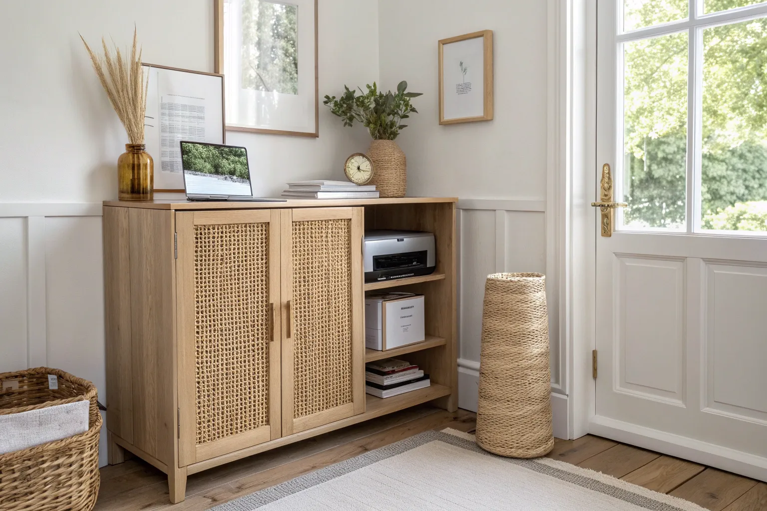 - Cane Door Sideboard: Choose a sideboard with breathable cane or rattan doors to hide equipment while maintaining stylish airflow.