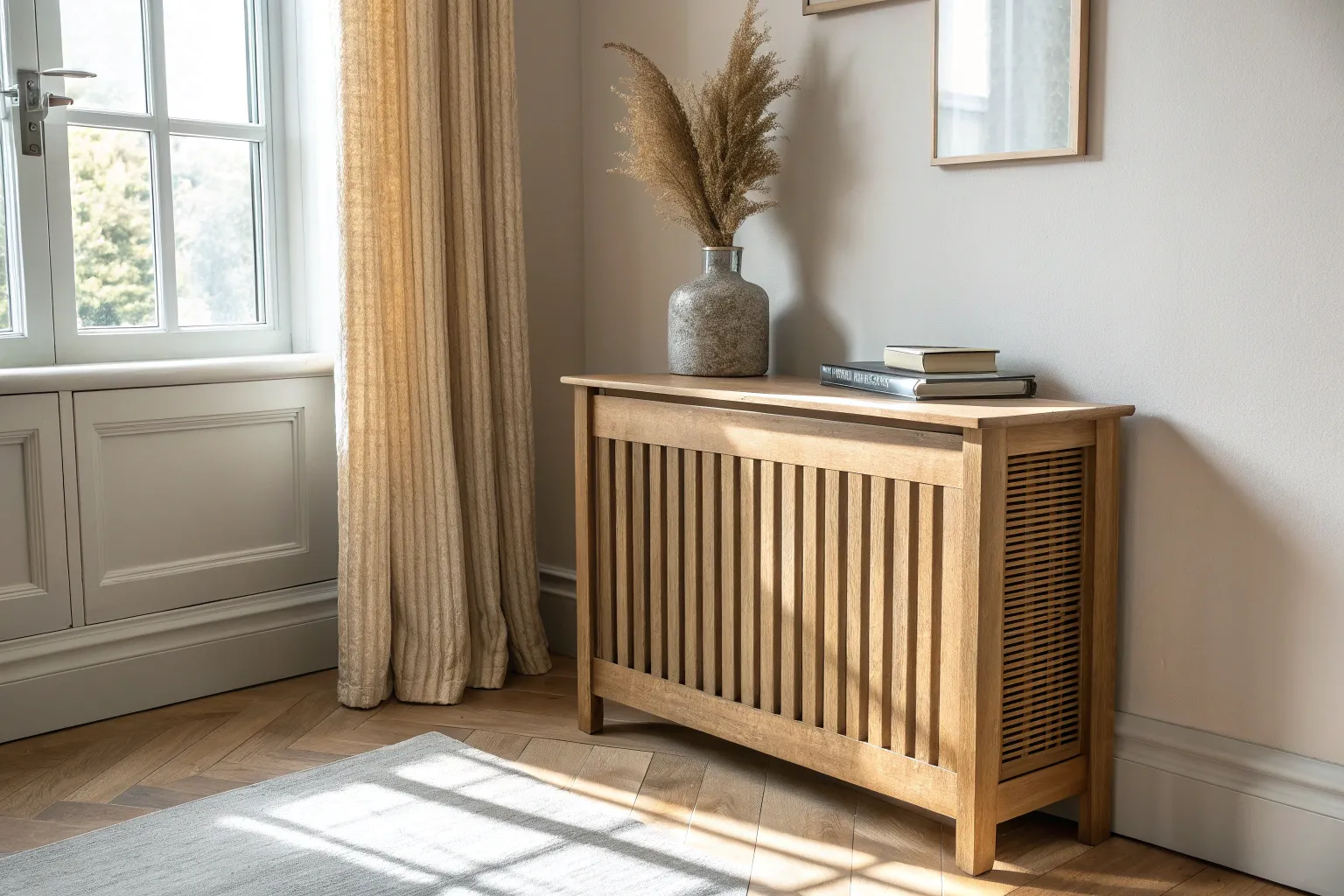 In my hallway, I paired a white radiator cover base with a warm wood top, and it instantly read like a slim console table. I style it with a small tray and a vase, and it finally feels like useful space instead of dead space.