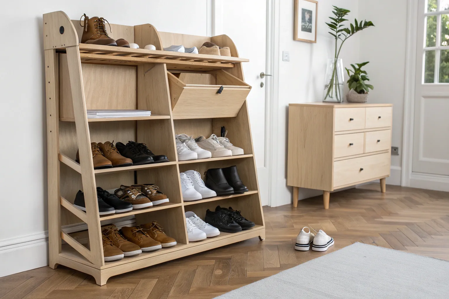 Sit-and-store bench: a chic entryway seat that hides everyday shoes for a calm, tidy look.