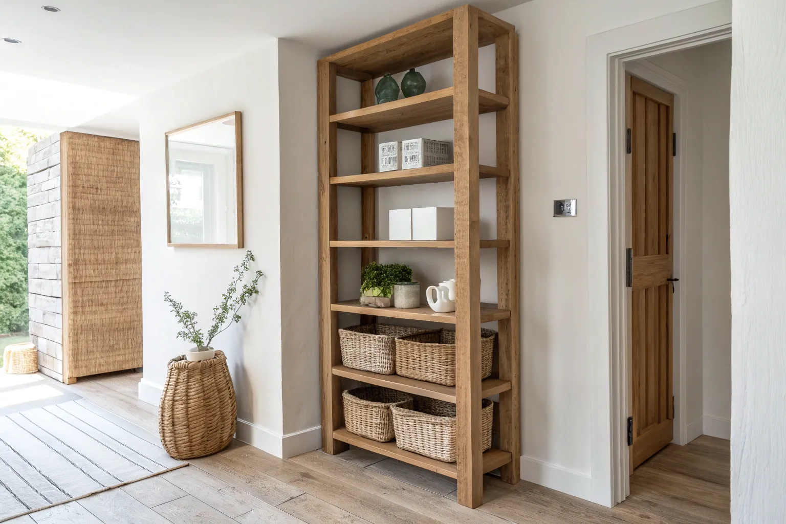 Turn an empty corner into storage: a sleek corner shelf for plants, books, and baskets.
