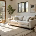 • Compact Loveseat Sofa: Choose a neutral, streamlined sofa to anchor your seating zone without blocking flexible open-plan pathways.