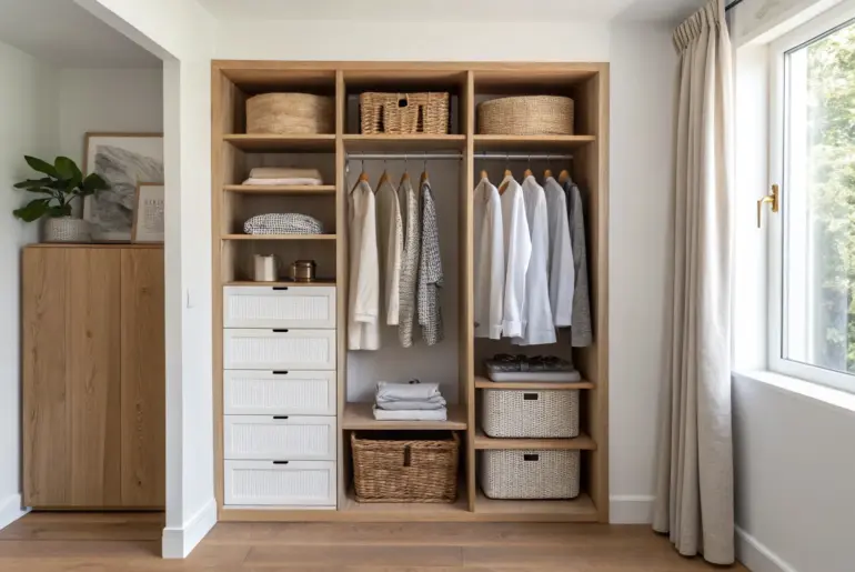 • Woven Storage Baskets: Keep accessories organized by tucking hats and gloves into natural woven baskets for accessible, high shelf storage.