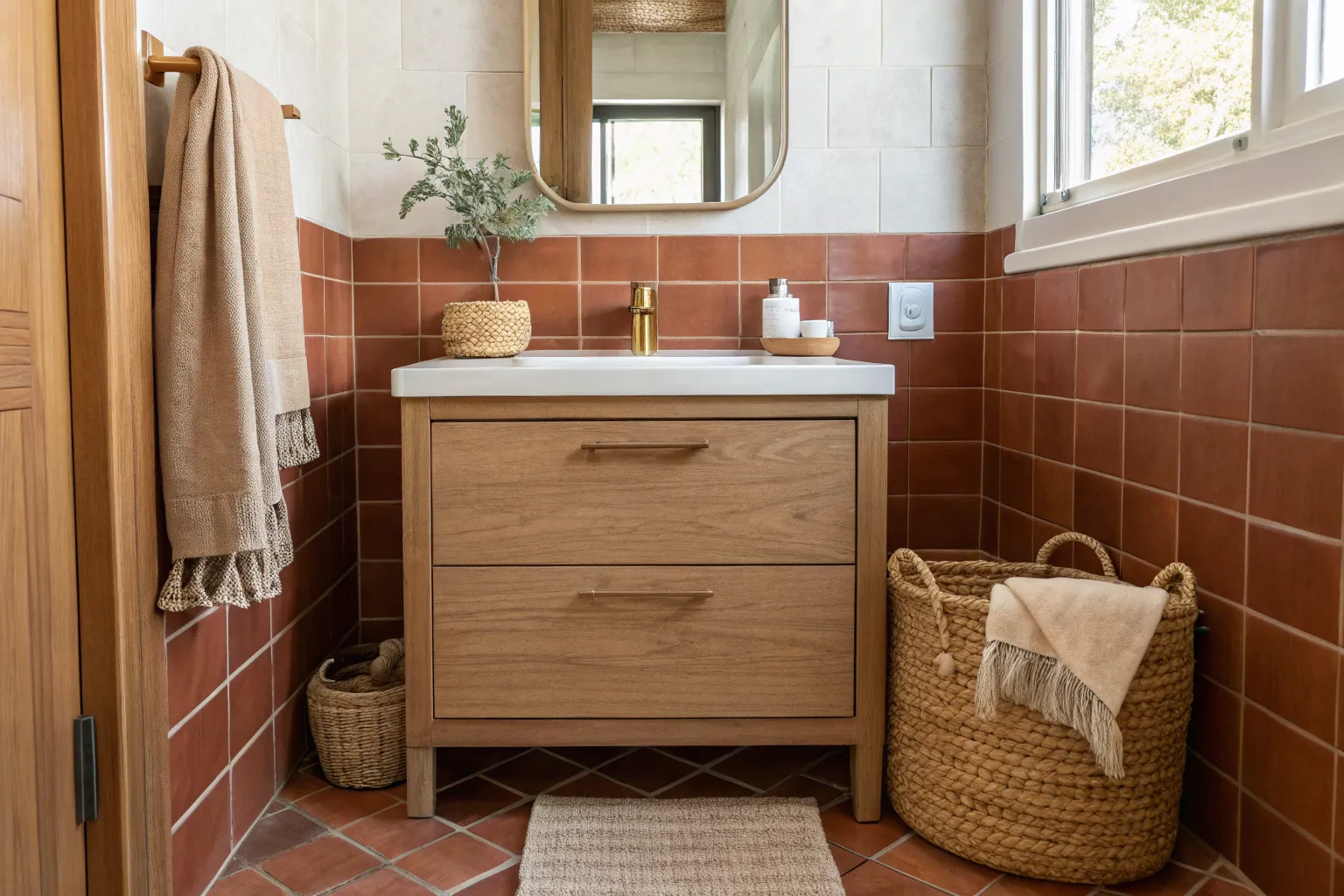 A brown tile border is my favorite “commitment-lite” move for small bathrooms because it adds detail without covering every wall. I’ve used it to frame a mirror and it looked custom even on a budget.