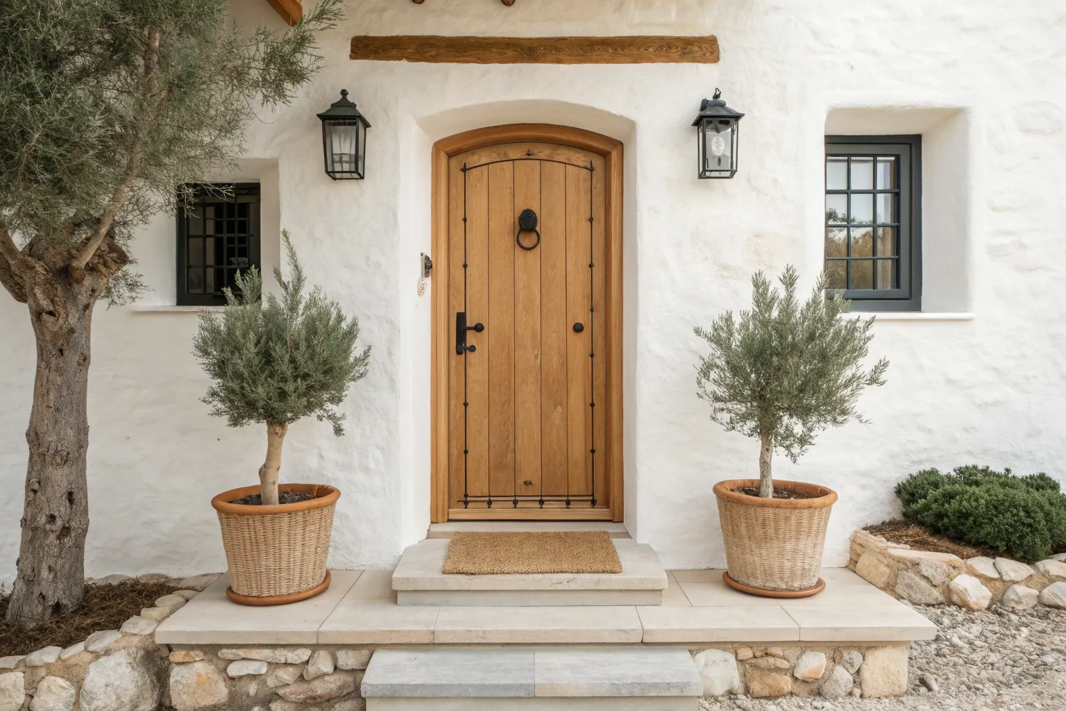 I love using tall potted trees to flank a front door because they create instant “entry columns” without construction. I’ve used this trick on recessed doorways, and it makes a small front entrance look taller and more intentional.