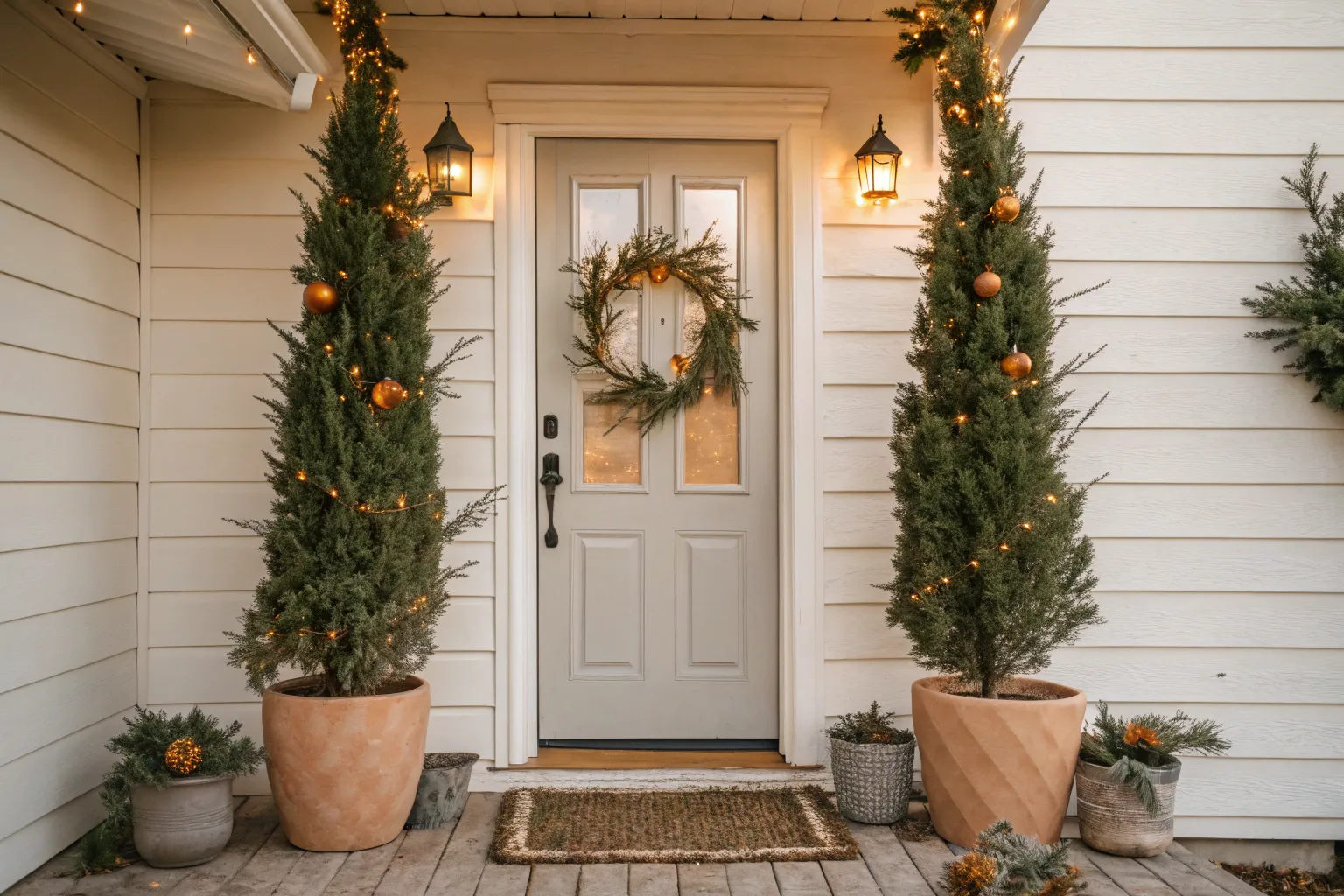My go-to move is a pair of mini Christmas trees in pots on either side of the door because it creates instant front door framing in a tight space. I do this every year in my own compact entry, and it makes the porch feel “grand” without taking up extra floor space.