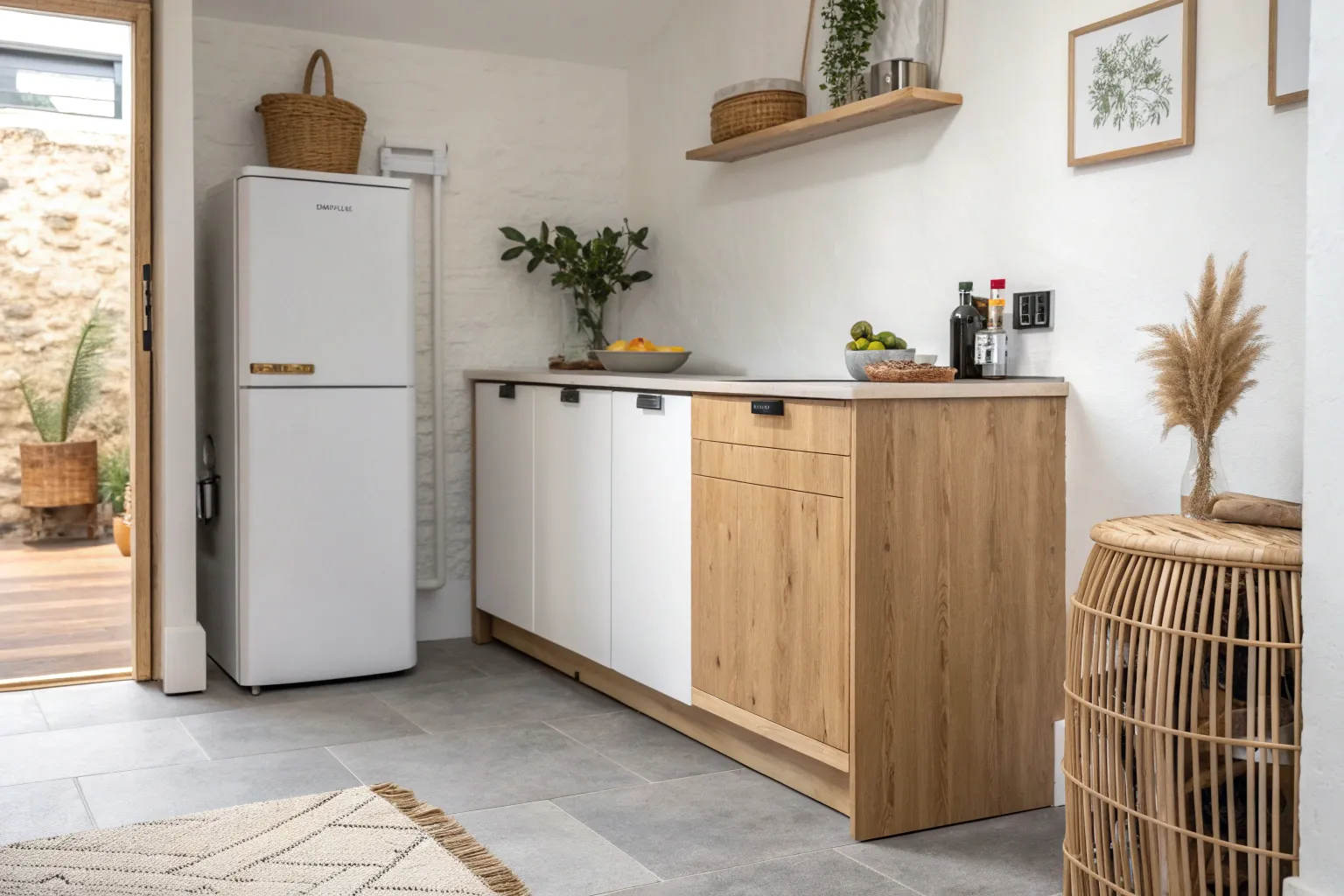 - Woven Storage Baskets: Use texture-rich baskets on top of your fridge or shelf to hide clutter while adding warmth.