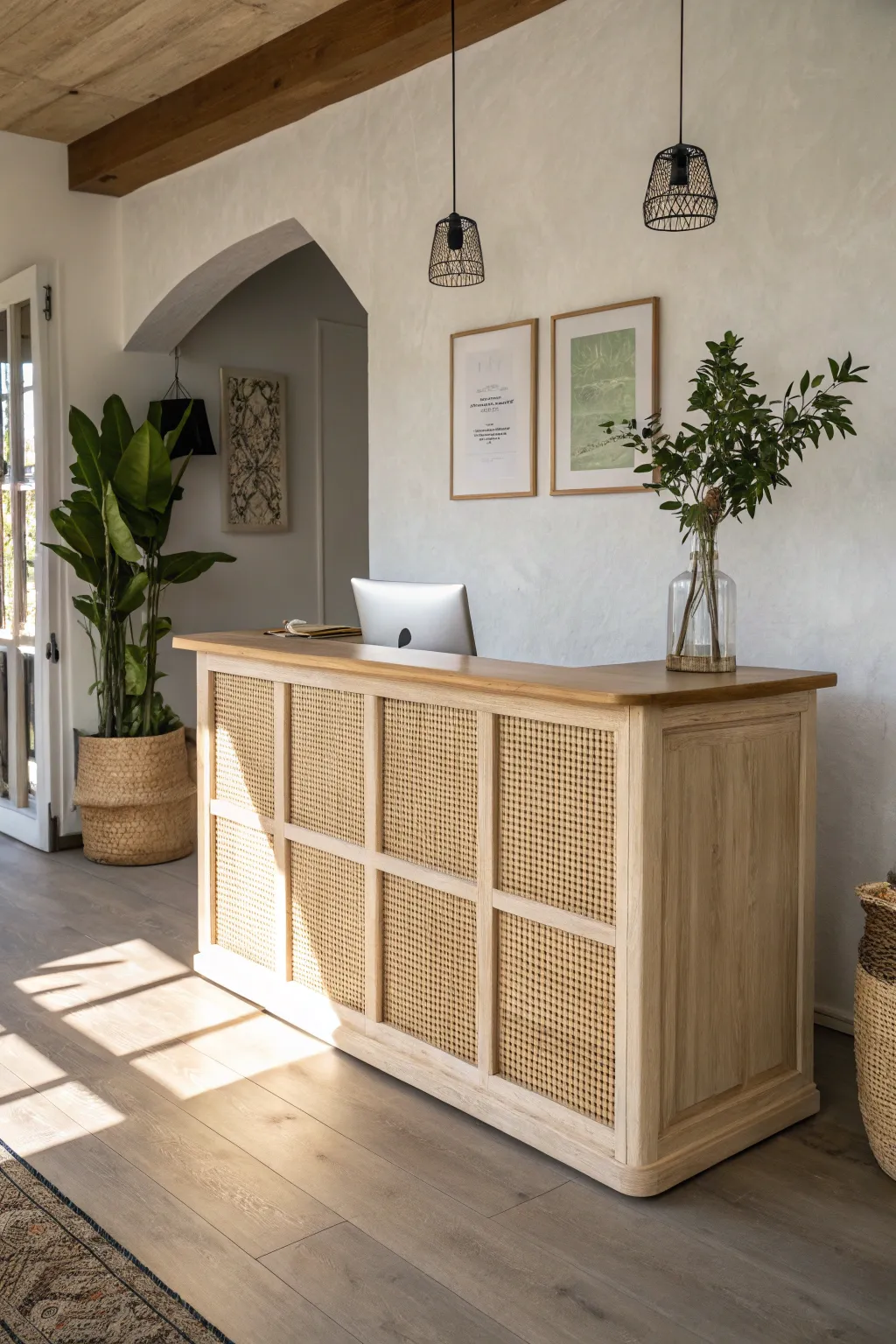 • Rattan or Cane Reception Desk: Create an inviting entry point with a textured desk that effectively hides clutter and defines your workspace.