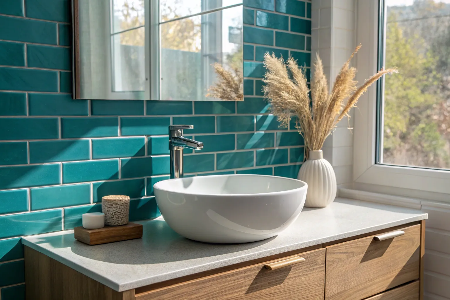 - Glossy Teal Ceramic Subway Tile: Recreate this vibrant look with glossy teal tiles that reflect light and make small spaces feel bigger.