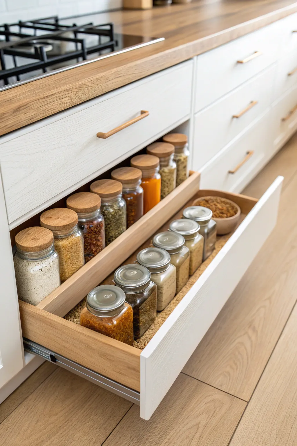- Square Glass Spice Jars with Bamboo Lids: Keep your new hidden drawer organized and uniform with these aesthetic, airtight jars perfect for laying flat.