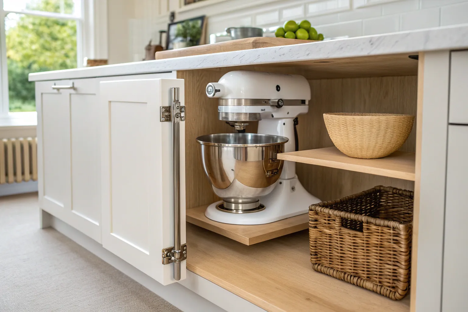 A mixer lift inside a lower cabinet is the closest thing I’ve found to “magic” in a small kitchen, because the stand mixer comes up to counter height without you lifting it. I always suggest placing it near your prep area because I learned the hard way that convenience is everything.