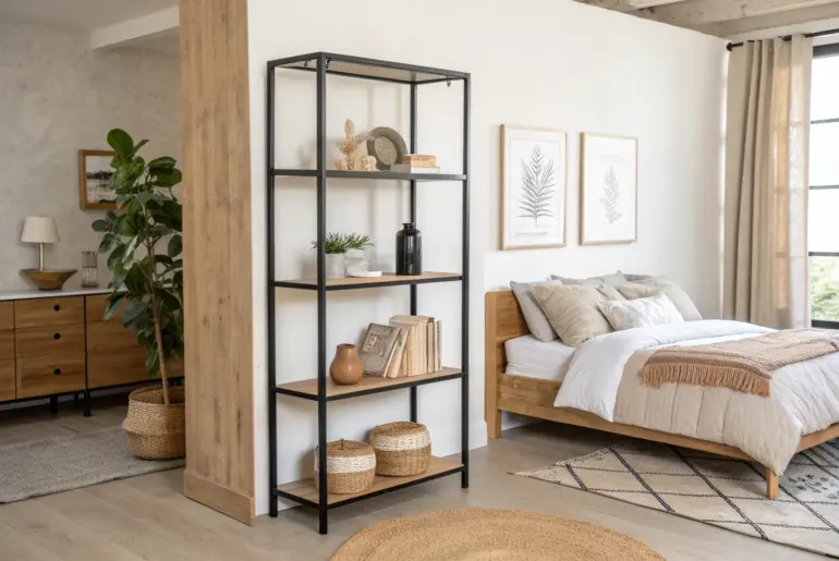 - Industrial Style Bookshelf: Organize your studio and separate living areas clearly with this stylish, sturdy industrial-look open shelving unit.