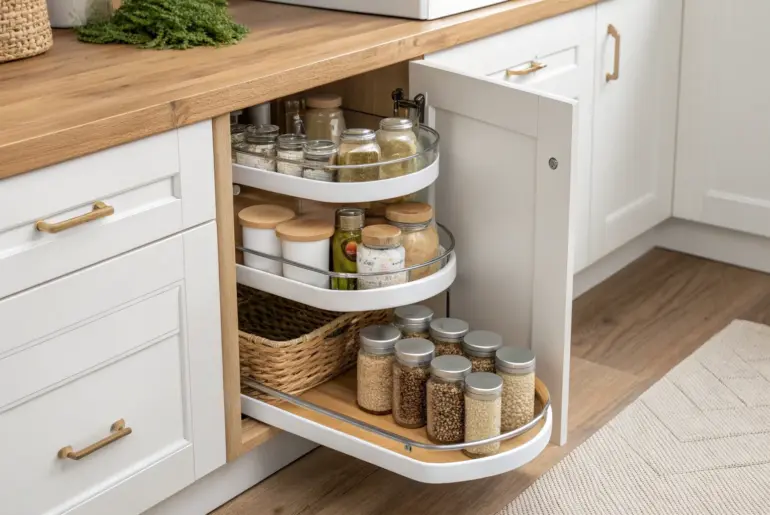 - Narrow Base Cabinet Pull-Out Organizer: Transform tight gaps in your kitchen into functional storage for folded tablecloths or hanging textiles using this unit.
