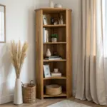 Use slim wall shelves to store books face-out, then reserve floor storage for the toy bins. In my own place, this made the play corner feel styled instead of stuffed.