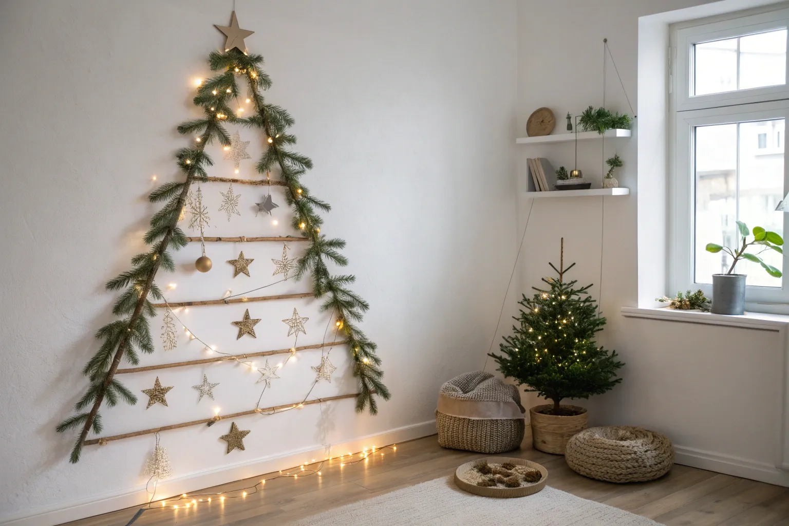 I lean or mount wood slats in a simple triangular arrangement and add a few ornaments for a clean, modern wall Christmas tree. I built a super basic version with scrap wood once, and it gave that cozy cabin vibe without the bulk.