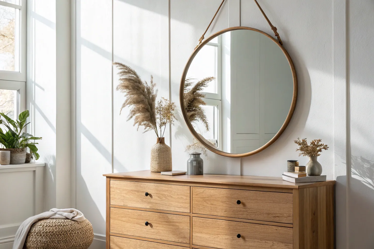 - Woven Rope Vase: Complement your display with a textured vessel that adds warmth and style on the dresser surface below.